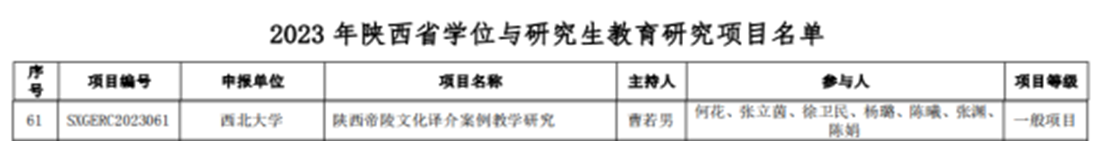 Recently, the Shaanxi Provincial Center for Academic Degrees and Graduate Education Research announced the results of the selection for the 2023 Shaanxi Provincial Academic Degrees and Graduate Education Research Projects. Our university has a total of 8 projects selected, among which the project “Research on Case Teaching of Shaanxi Imperial Mausoleum Culture Translation” proposed by our school was selected as a general project.