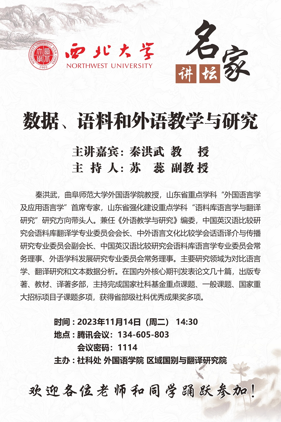 Qin Hongwu, Professor at the School of Foreign Languages, Qufu Normal University, and chief expert of the Key Discipline "Foreign Linguistics and Applied Linguistics" in Shandong Province, leads the research direction of "Corpus Linguistics and Translation Studies," a key discipline in Shandong Province. He also serves as an editorial board member of Foreign Language Teaching and Research and holds various positions in academic committees such as chairman of the Corpus Translation Studies Professional Committee of the China Association for Comparative Studies of English and Chinese, vice chairman of the Discourse Translation and Communication Research Professional Committee of the Association for Comparative Studies of Chinese and Foreign Languages and Cultures, executive director of the Corpus Linguistics Professional Committee of the China Association for Comparative Studies of English and Chinese, and executive director of the Professional Committee for Foreign Language Discipline Development Research.