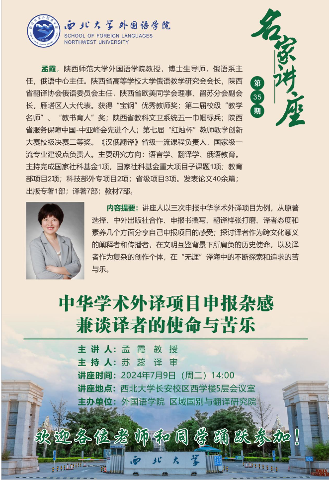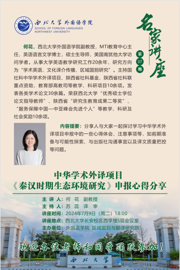 Speaker: He Hua, Associate Professor at the School of Foreign Languages, Northwest University, Director of the MTI Education Center, PhD in English Language and Literature, and Visiting Scholar at Southern Utah University. With over 20 years of experience in college English teaching and research, her research focuses on academic English, cultural translation and communication, and regional studies. Professor He has led more than ten projects, including the National Social Science Fund Chinese Academic Translation Project, Shaanxi Provincial Social Science Fund, and key projects supported by the Shaanxi Provincial Federation of Social Sciences and the Ministry of Education. Besides, Professor He also has published over 30 academic papers and received more than ten awards for her teaching, research, and social contributions. Her rewards include the “Outstanding Master’s Thesis Supervisor” at Northwest University and the “Second Prize for Graduate Education Achievements” in Shaanxi Province, and Outstanding Individual for Service and Support at the China-Central Asia Summit.