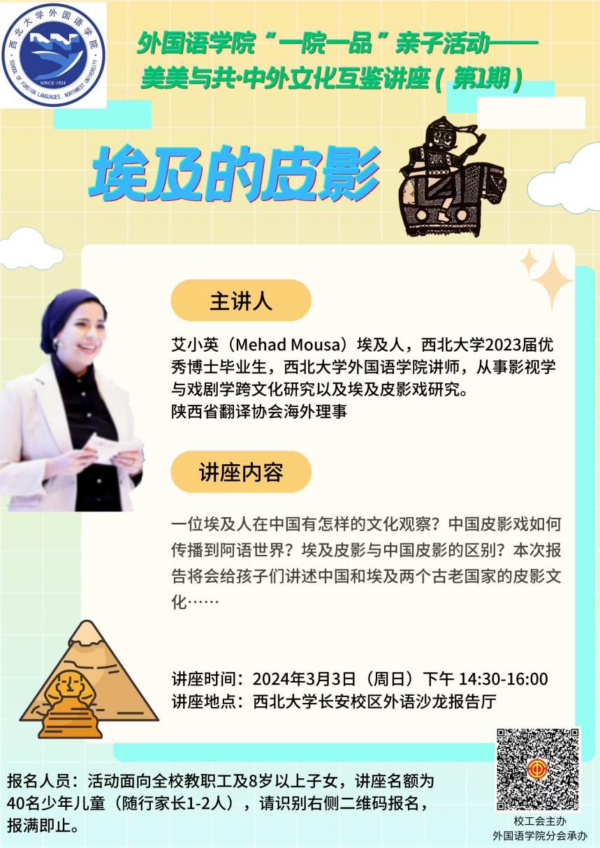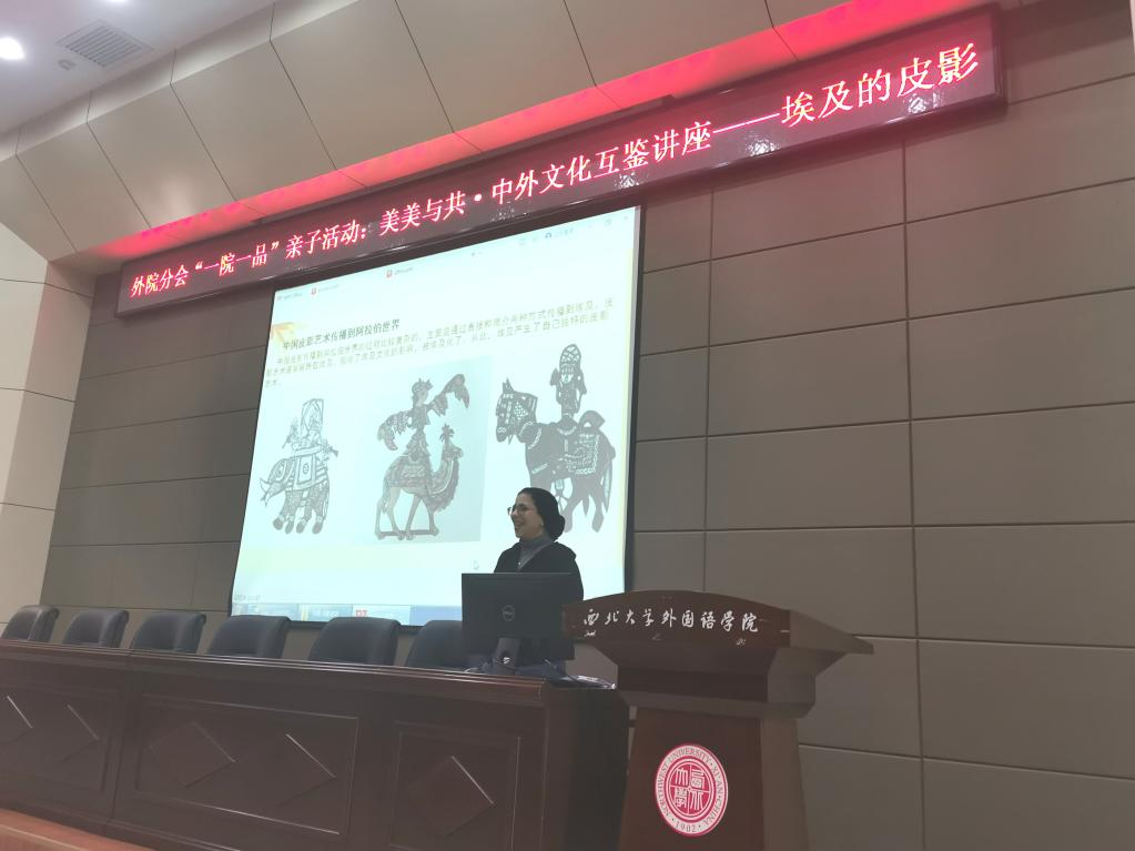 2024年3月3日下午,一场别开生面的“埃及的皮影”讲座在西北大学长安校区外语沙龙报告厅举行。本次讲座是外国语学院分会“一院一品”亲子活动的首场讲座,主讲人为外国语学院的埃及外教艾小英(Mehad Mousa)博士,为我校教职工及其子女讲述“美美与共·中外文化互鉴”大背景下的中国和埃及文化交流与传播。