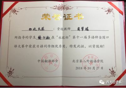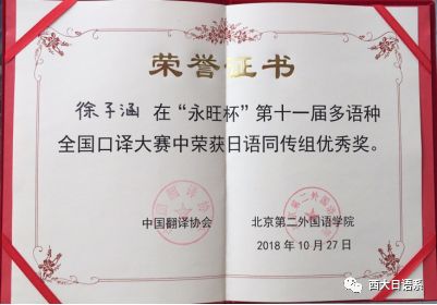 由中国翻译协会和北京第二外国语学院主办,中国对外文化传播研究院和北京对外文化传播研究基地承办的“永旺杯”第十一届多语种全国口译大赛10月27日在北京第二外国语学院成功举办。我院日语系2015级学生徐子涵在日语同传组复赛中获得优秀奖。