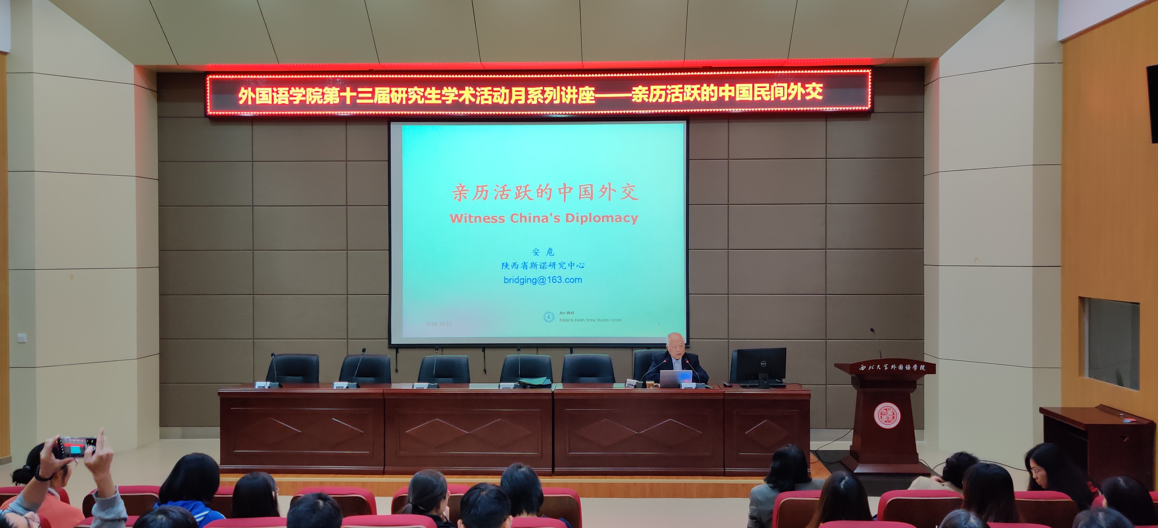 1021日下午,资深翻译家、陕西斯诺研究中心主席、陕西翻译协会名誉主席、原中国翻译协会会长安危先生在第二课堂作了题为亲历活跃的中国民间外交的学术讲座,吸引了外国语学院百余师生。此次报告由外国语学院院长胡宗锋教授主持。