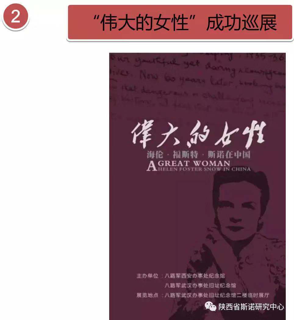 2018年37日,“伟大的女性——海伦·斯诺专题展览”在黑龙江省东北烈士纪念馆展出;41日,海伦展览在八路军武汉办事处旧址纪念馆开展。海伦斯诺展览走出陕西,配合革命传统教育,以积极的方式面向公众和青少年。
