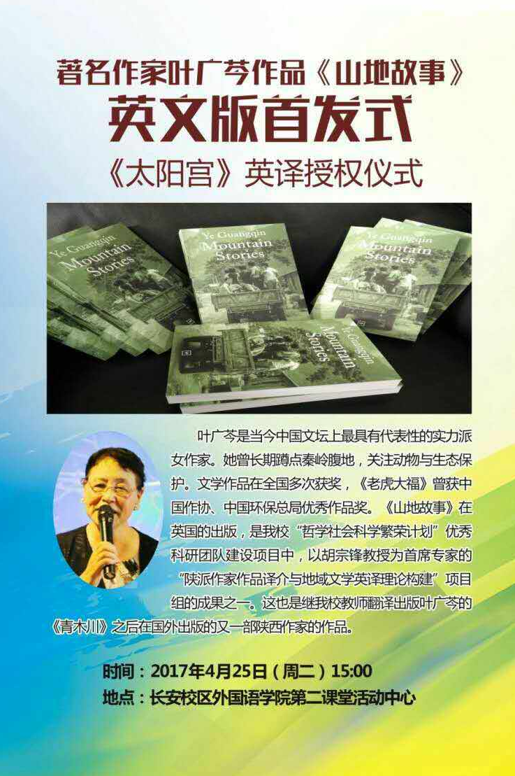 4月25日下午,著名作家叶广芩作品《山地故事》英文版首发式—《太阳宫》英译授权仪式在我院举行。