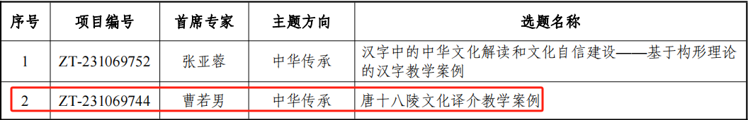 2023年12月,教育部学位与研究生教育发展中心面向全国研究生培养单位开展主题案例征集工作,扎根中国大地,聚焦时代热点,汇聚各方力量,开发具有时代性、引领性、学理性、创新性的高质量案例。经过“单位审核推荐”“专家分组评议”“案例专家委审核”三级评议审核及结果公示,校共有2项选题入围,其中我院曹若男教授申报的“唐十八陵文化译介教学案例”入围,实现了学院在国家级案例库项目申报方面零的突破。