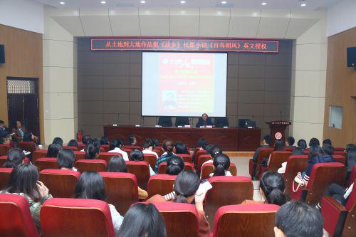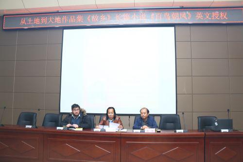2017年10月14日下午,中国作家协会会员、陕西省作家协会副主席红柯先生的作品集《故乡》和长篇小说《百鸟朝凤》英译授权仪式在我院第二课堂报告厅举行。这是继我校国际交流学院任惠莲院长翻译其《大漠人家》后,红柯再次向我校翻译团队授权。