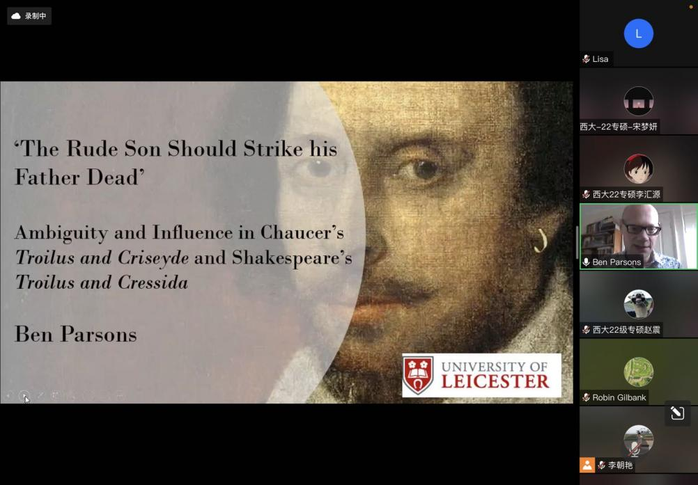 2023年3月15日下午,必赢亚州242名家讲座系列第十二期如期举行。英国谢菲尔德大学博士、英国莱斯特大学文学副教授、英国中世纪晚期文学研究专家Ben Parsons与外国语学院师生140余人相聚云端,作了题为“《特洛伊罗斯与克瑞西达》中的含混与影响:乔叟与莎士比亚创作对比”的主题讲座。本次讲座由我院教师Robin Gilbank博士主持。