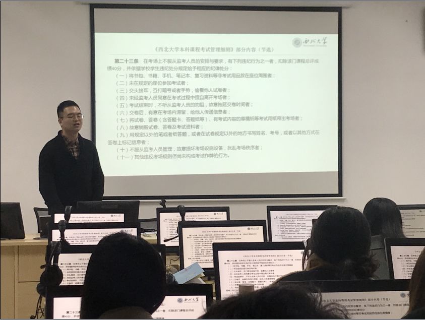 在各宣讲会中,我们强调诚信考试的重要性,要求严肃考风考纪,坚决杜绝考试作弊行为。宣读了《西北大学学生违纪处分规定》、《西北大学本科生课程考试管理细则》等相关文件,并结合各类考试违纪案例,再三强调了考试作弊的严重性。最后,全体学生签订了《考试诚信承诺书》。