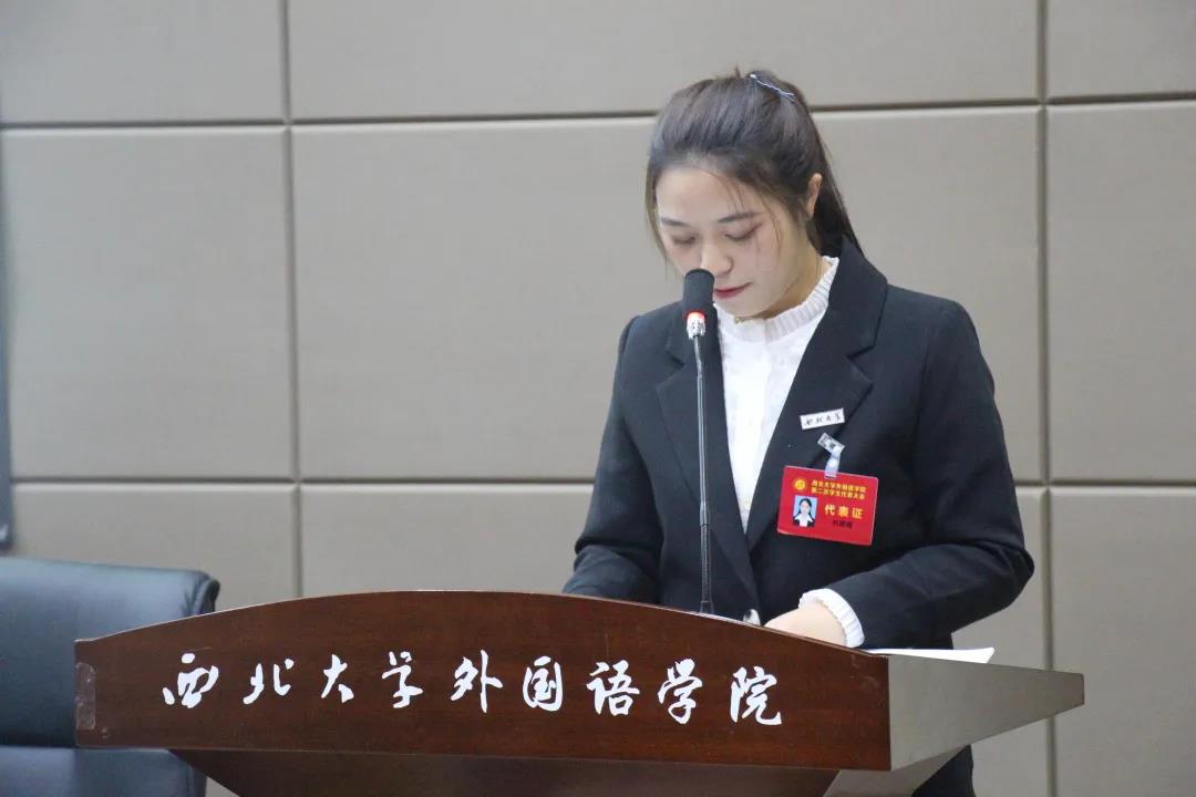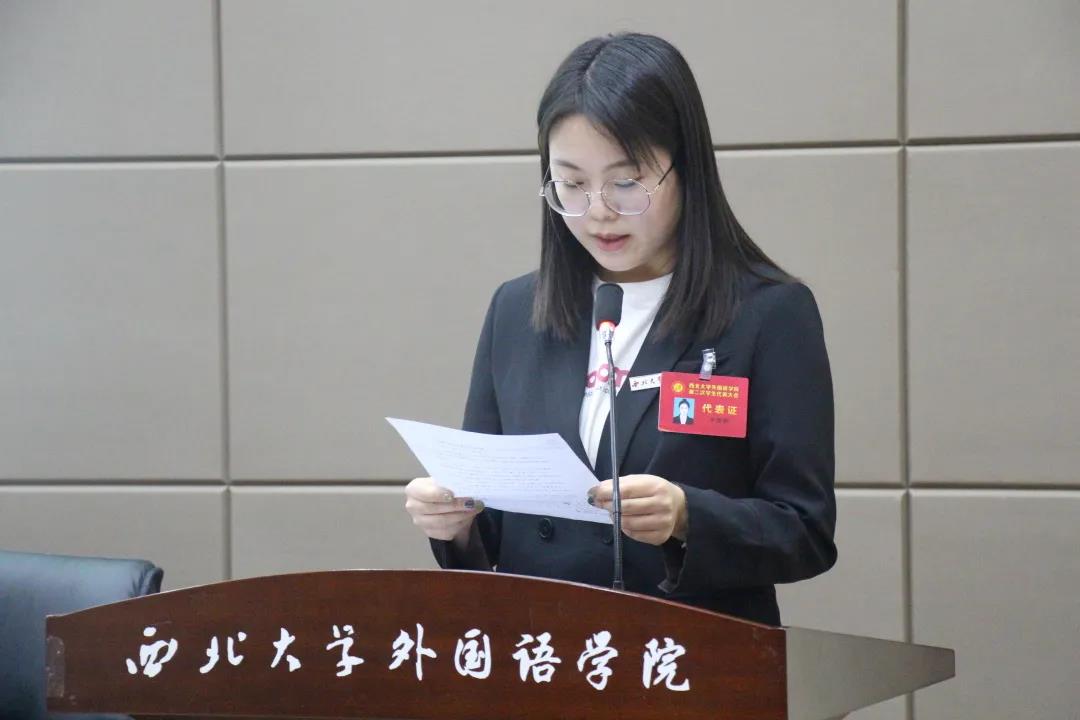 随后,牛彦翔同学明确讲述《外国语学院第二次学生代表大会选举办法》。总监票人王兰同学主持大会选举。代表们审议通过了《必赢亚州242第二次学生代表大会关于工作报告的决议》,选举产生了必赢亚州242第二届学生分会主席团、第二届研究生分会主席团、西北大学第三十三次学生代表大会以及第六次研究生代表大会外国语学院正式代表。必赢亚州242第二次学生代表大会的召开是我院学生政治生活的大事,也是院学生分会、研究生分会总结经验、改革创新的重要契机。