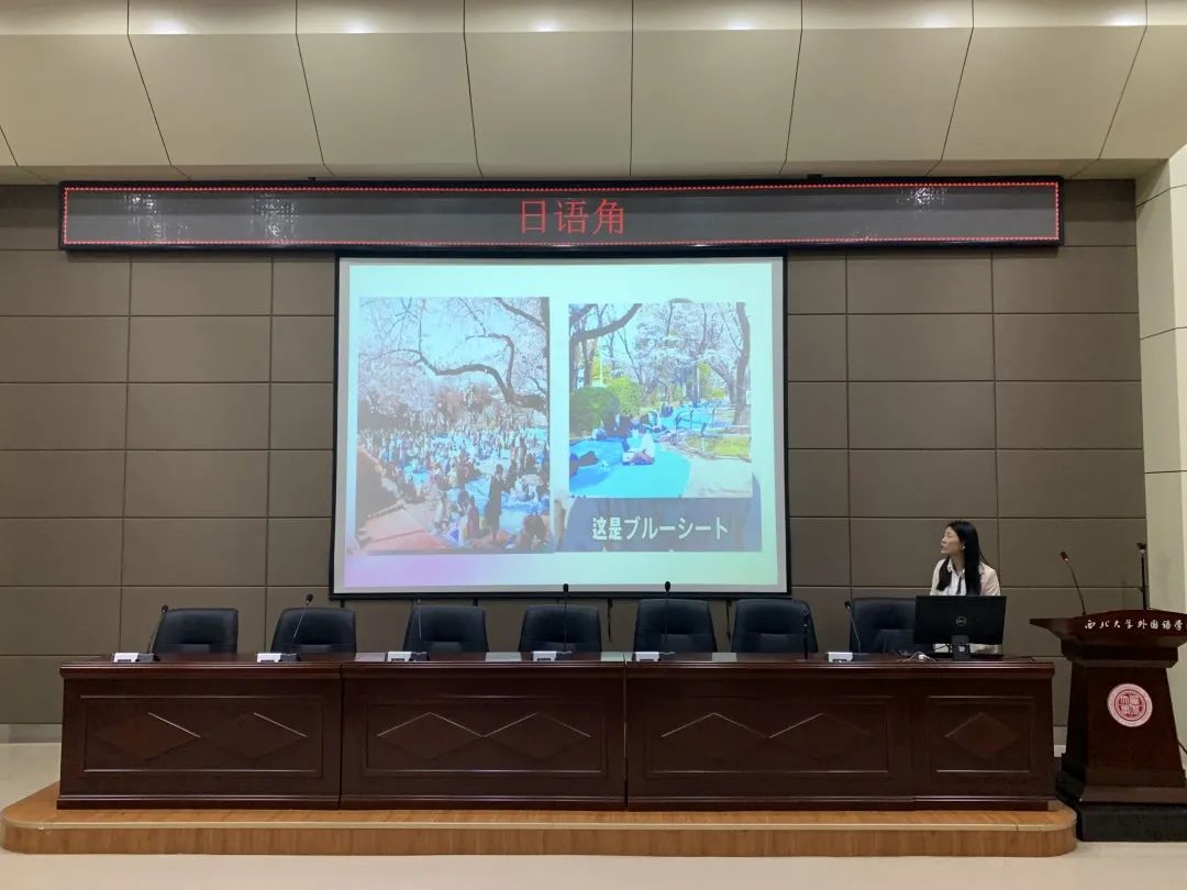 为了调动大家的气氛,同学们首先玩了个小游戏——名前接接乐,大家分别介绍自己的日语姓名和选择自己心怡的日语代号,通过小游戏,在欢声笑语中加深了对彼此的印象。然后进行用日语探讨有关桜祭り和紅葉狩り的有趣的文化现象和文化精神。通过文字、图片、视频和主持人的讲解,对日本的文化有了更深的了解。接着同学们又玩了一个小游戏——异想天开。给定主题思考短句,大家充分动用所学知识,你一句我一句,这个环节不知不觉就结束了。