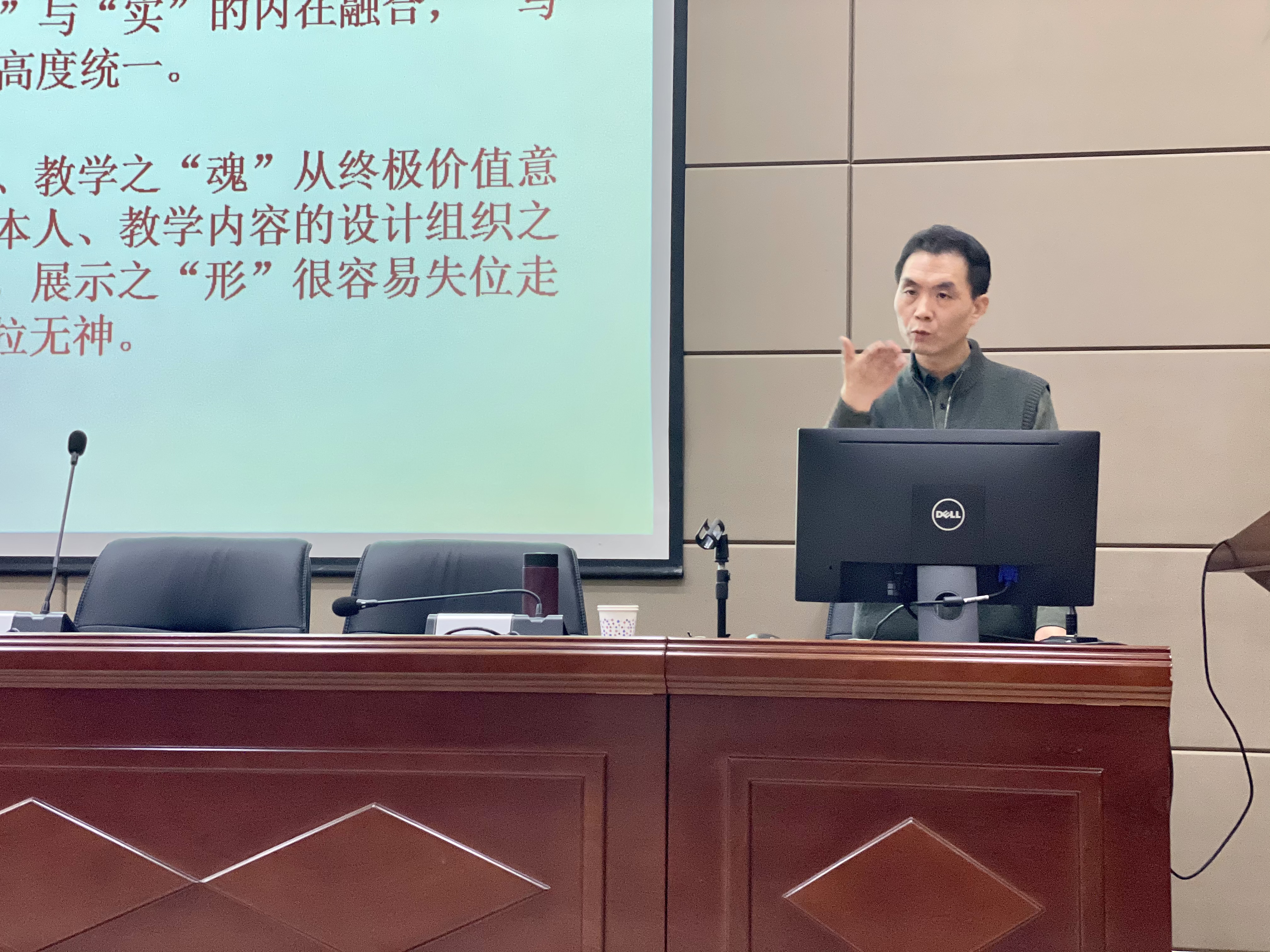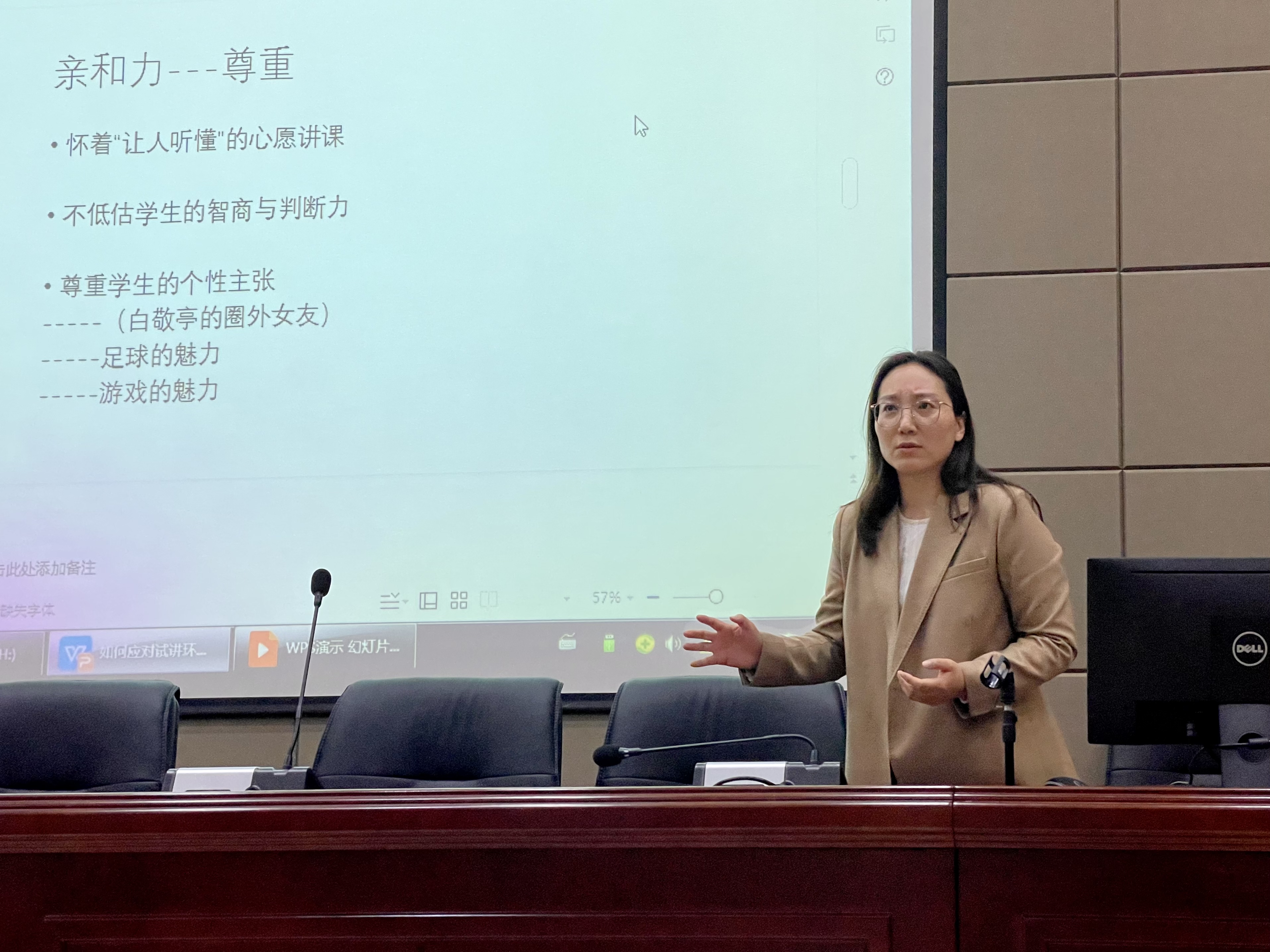 陈娟老师在讲座中以中国武术作为比喻: “内练一口气,外练一张皮”,这“一口气”即是作为一名老师内在的道,而在考教试讲中,往往要靠外在的“皮”,也就是靠授课技巧和良好精神面貌更好地发挥个人能力。同时,陈娟老师指出,在师生互动中,提问本身不是互动,更要关注学生的反馈,给予学生足够的尊重和肯定。最后,陈老师还介绍了“自拍-自查-自信”的方法,可以帮助自身向一名合格老师看齐,并且强调了“爱”在教育中的重要性:爱学生、爱自己是成为一名好老师的关键。