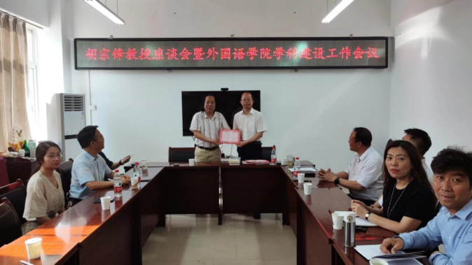 讲座结束后,胡宗锋教授还与外国语学院的部分老师进行了座谈。座谈会由宝鸡文理学院外国语学院 副院长史传龙教授主持,学院院长李伟教授、副院长冯琳副教授、学校西北工合研究中心首席研究员张占勤、王卫强教授、大外部主任张雨、翻译系主任鱼为全和翻译系全体教师参加了此次座谈会。