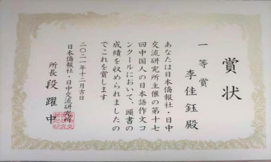 此次的中国人日语作文大赛一等奖是继2019年我院日语专业毕业生朱琴剑同学之后,再一次荣获本项赛事荣誉,也是我校日语专业迄今为止获得的最高赛事奖项。在我院外教老师高桥智子的指导下,李佳钰同学在再三推敲修改后,提交了自己的参赛作文。经历历时一年的重重选拔,在全国3000余份参赛作文中,取得了中国人日语作文大赛一等奖的好成绩。