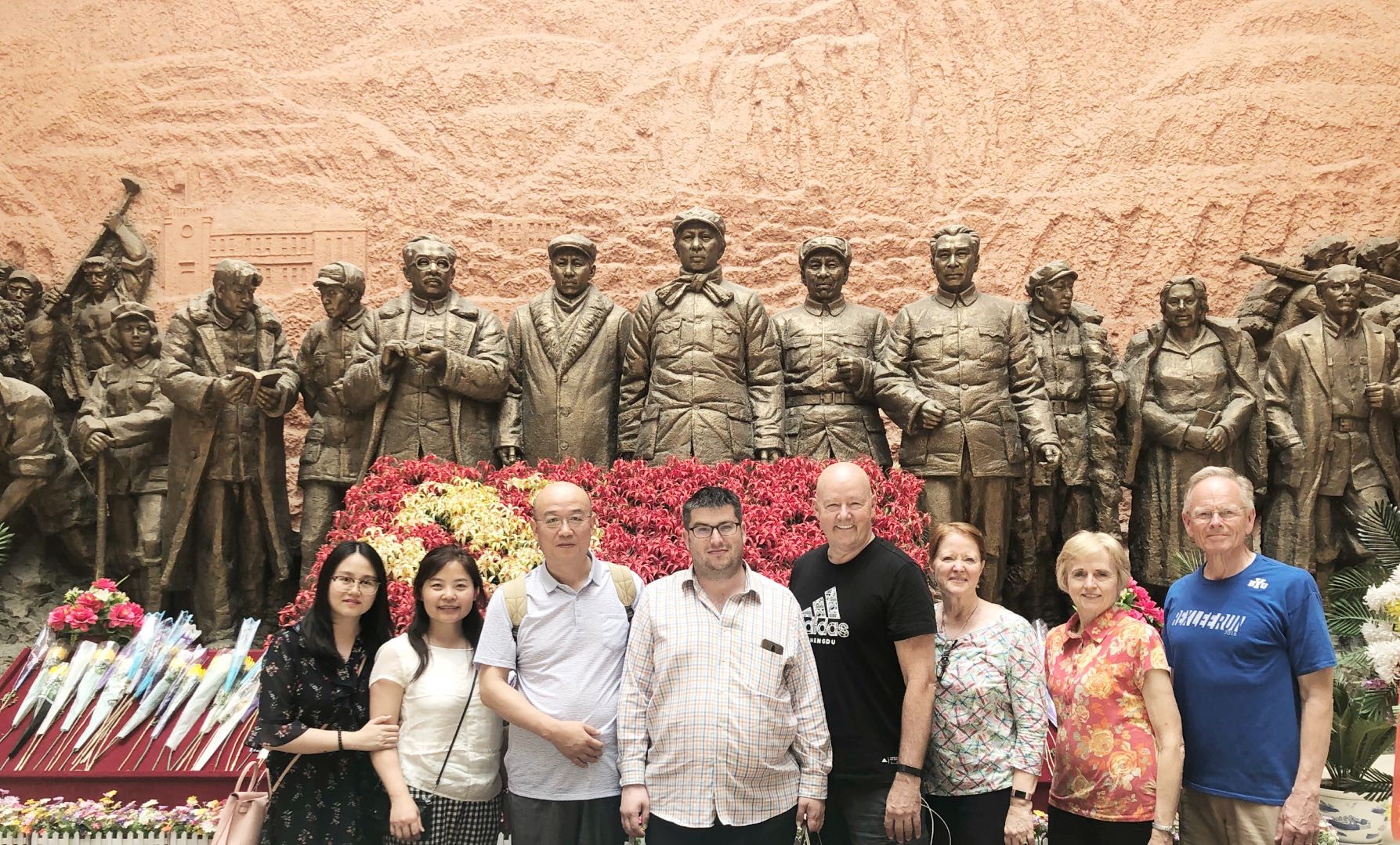外籍专家在毛泽东、周恩来、刘少奇、朱德、任弼时五位中央书记处书记雕像前留影