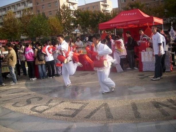舞台前的音乐广场上,我院的学生们搭建了印度、韩国、蒙古、西班牙、俄罗斯和中国六大展区和音乐、美食、服装三大专区,通过形式多样和内容丰富的活动传播和介绍着异域文化知识,展示异域文化魅力。