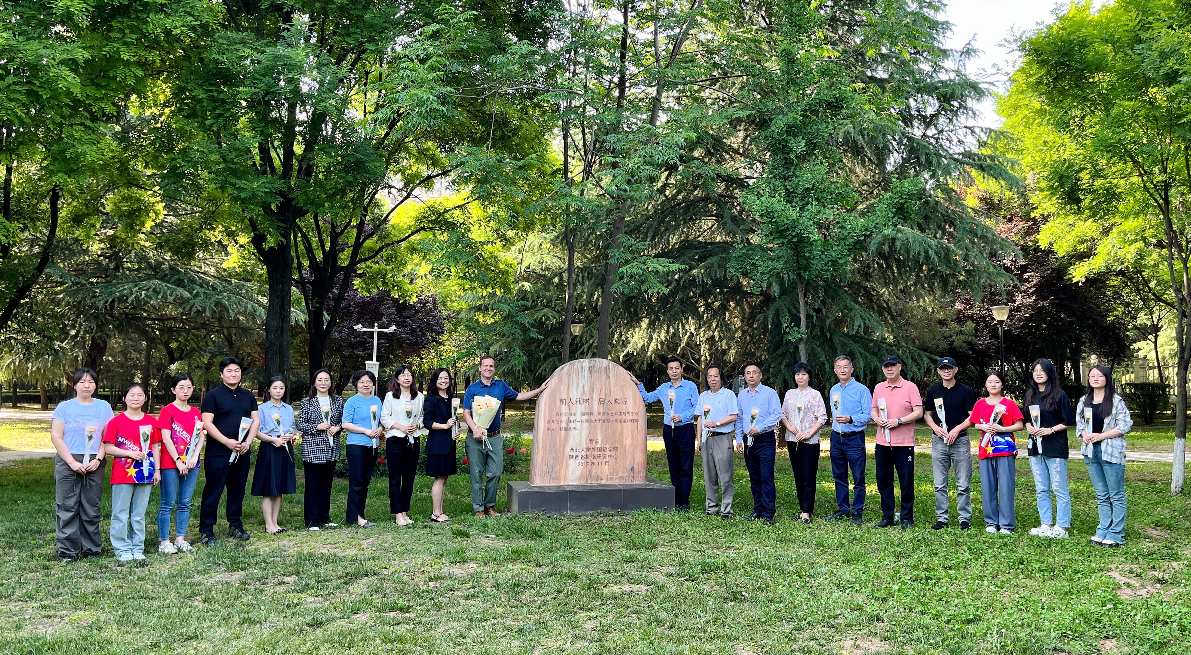 陕西省斯诺研究中心主任胡宗锋,我院党委书记王军,教师代表高敏娜、袁西玲、陈娟,以及学生代表参与了接待与拍摄,并与亚当、省广电局和省友协的探班人员一起,在中美友谊纪念碑前献花。