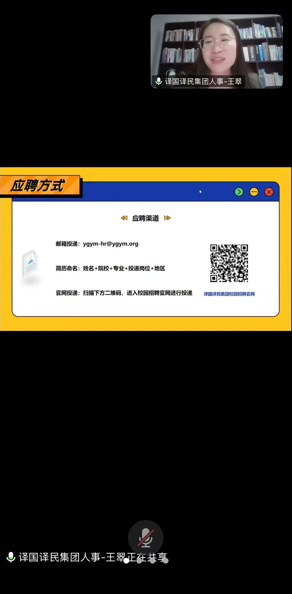 4月14日,译国译民集团举办的“2025届校招线上宣讲会·西北大学专场”顺利进行。学院高度重视此项活动,院长曹若男、MTI中心主任何花及辅导员老师同步在线出席。活动由何花老师主持,译国译民集团人力资源经理王翠对企业岗位需求和职业晋升通道等进行了详细介绍,并分享了企业典型翻译实践项目案例;与会学生围绕实习安排、技术培训、薪酬福利等问题进行了互动交流。最后,曹若男院长对译国译民集团为我院召开此次专场活动表示了感谢,并强调了校企协同创新翻译实践工作的重要性。活动吸引数十名应届本科生与研究生参加,现场互动充分、信息对接精准,为后续实习招聘和项目合作奠定了实质基础。