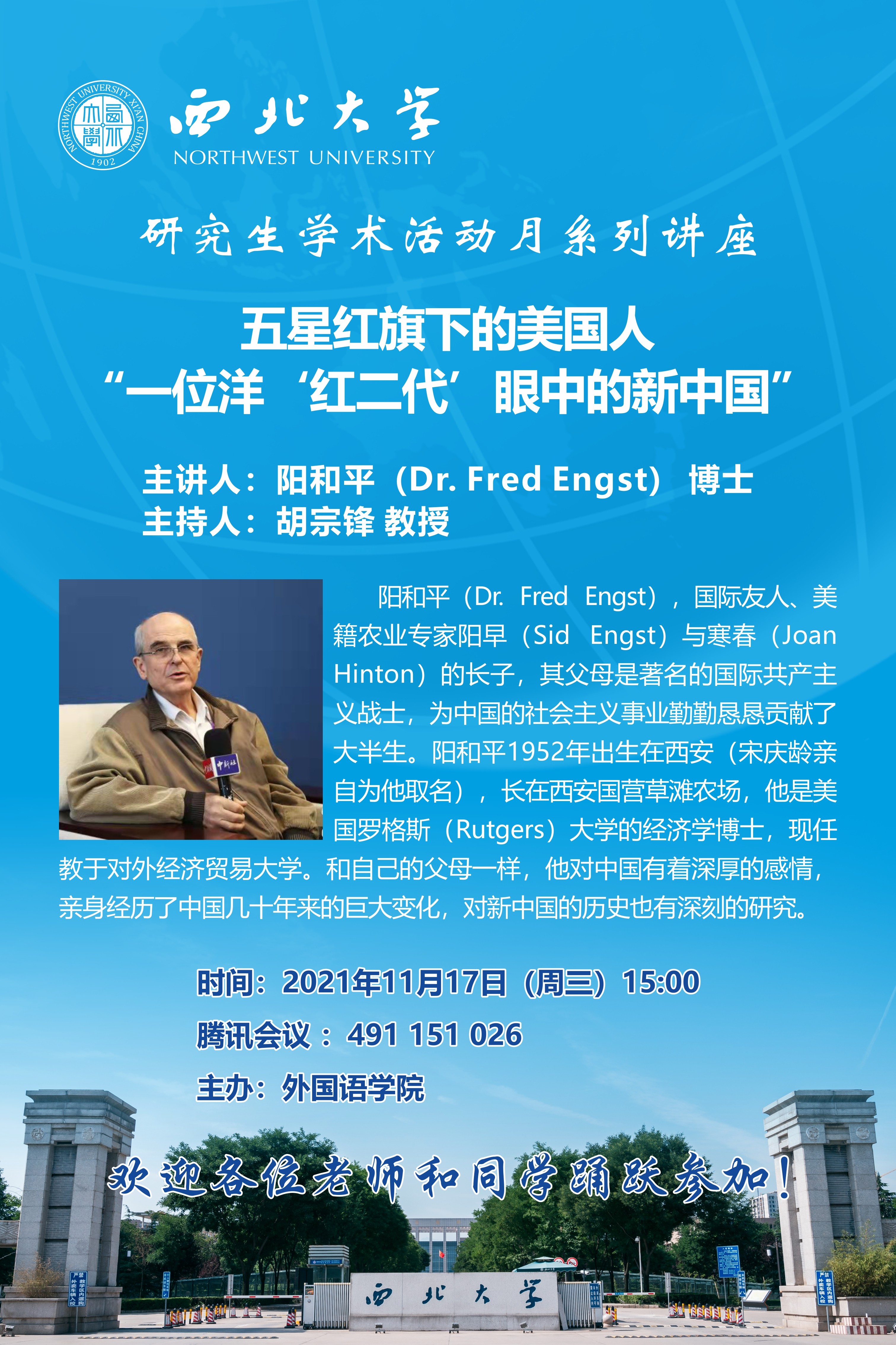 学院定于2021年11月17日(周三)下午15:00召开关于《五星红旗下的美国人“一位洋‘红二代’眼中的新中国”》讲座,欢迎各位师生积极参加。